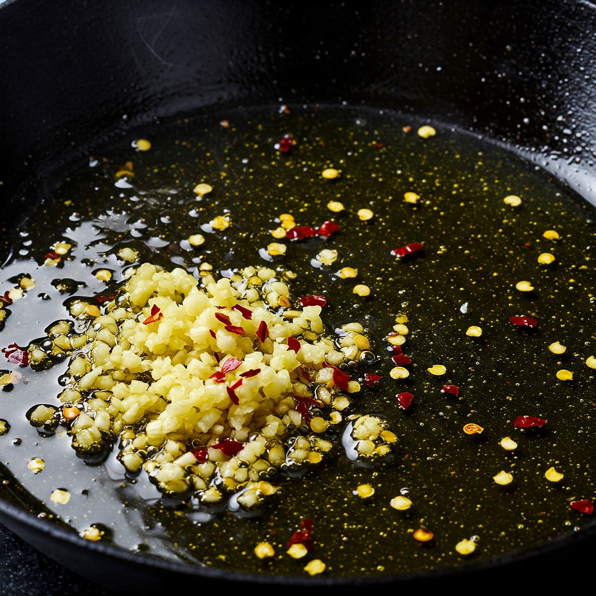 Heat olive oil in a large skillet over medium heat. Add minced garlic and red pepper flakes, sautéing for 1-2 minutes until fragrant but not browned.