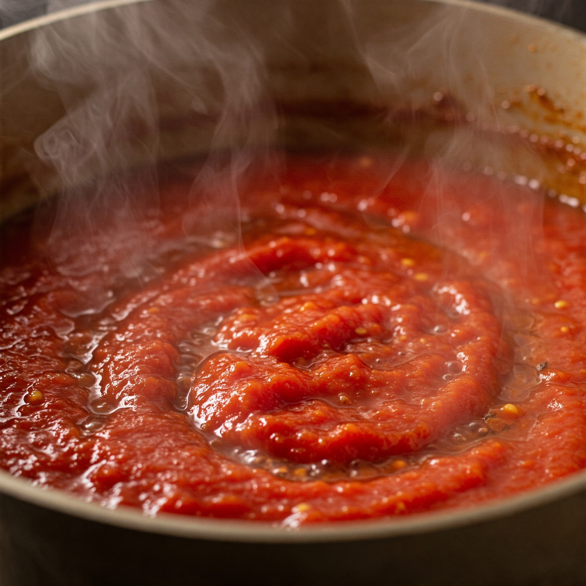Stir in the crushed tomatoes and season with salt. Simmer the sauce for 10-12 minutes, allowing the flavors to develop.
