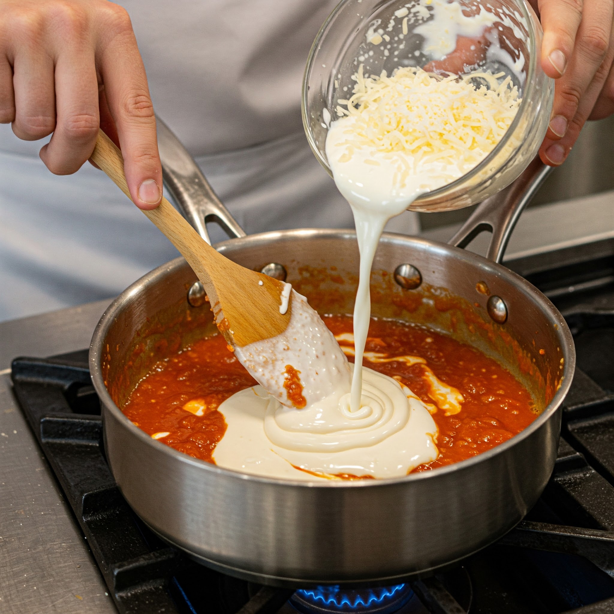 Reduce the heat to low and stir in the heavy cream and grated Parmesan cheese. Mix well until the sauce is smooth and creamy. If needed, thin the sauce with reserved pasta water, one tablespoon at a time.