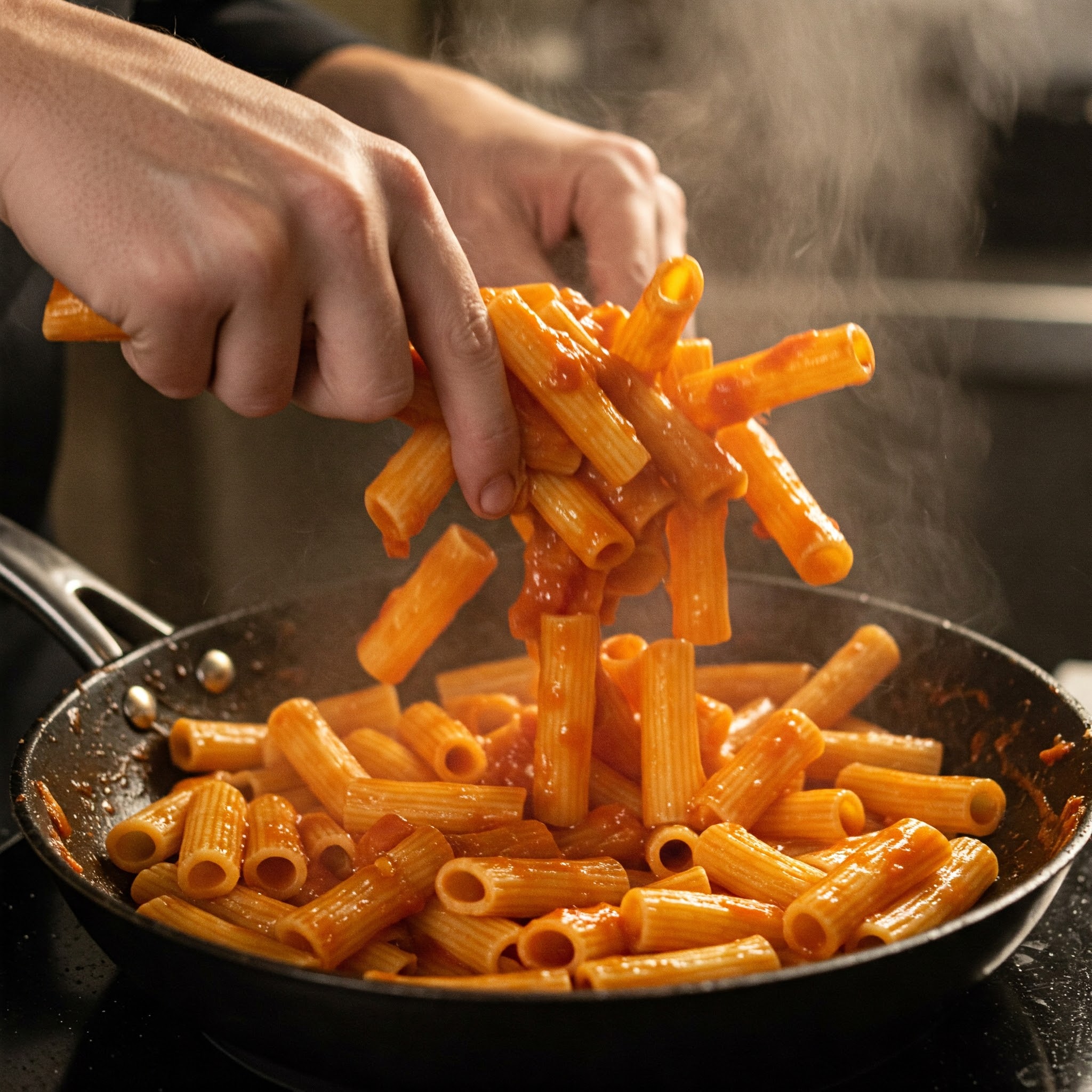 Add the cooked rigatoni to the skillet, tossing to coat evenly in the sauce. Let it cook together for 2-3 minutes, ensuring the pasta absorbs the flavors.