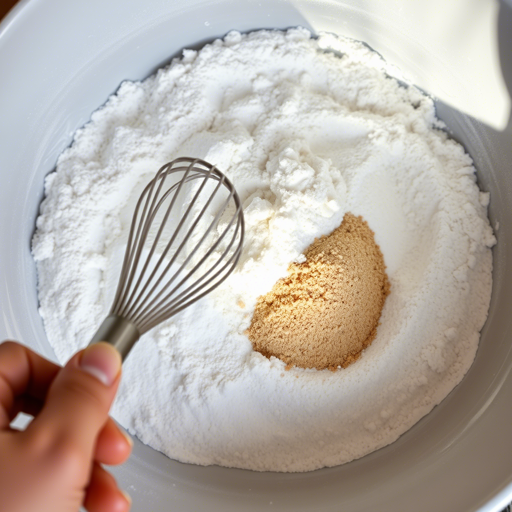 In a large mixing bowl, whisk together the flour, baking powder, salt, and sugar until evenly combined. This ensures even distribution of leavening agents for maximum fluffiness.