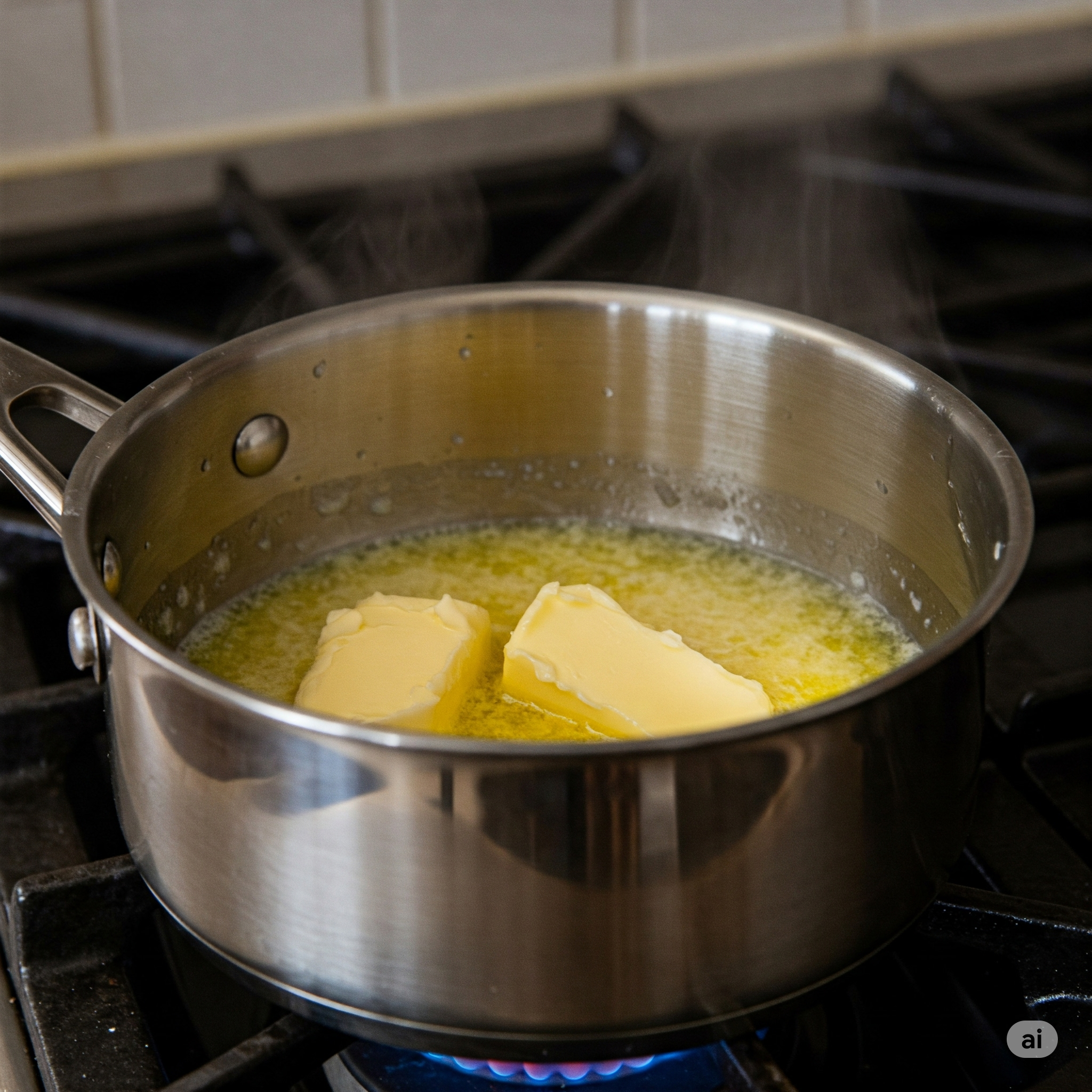 In a medium saucepan over low heat, melt the butter until just melted. Remove from heat and let cool slightly.