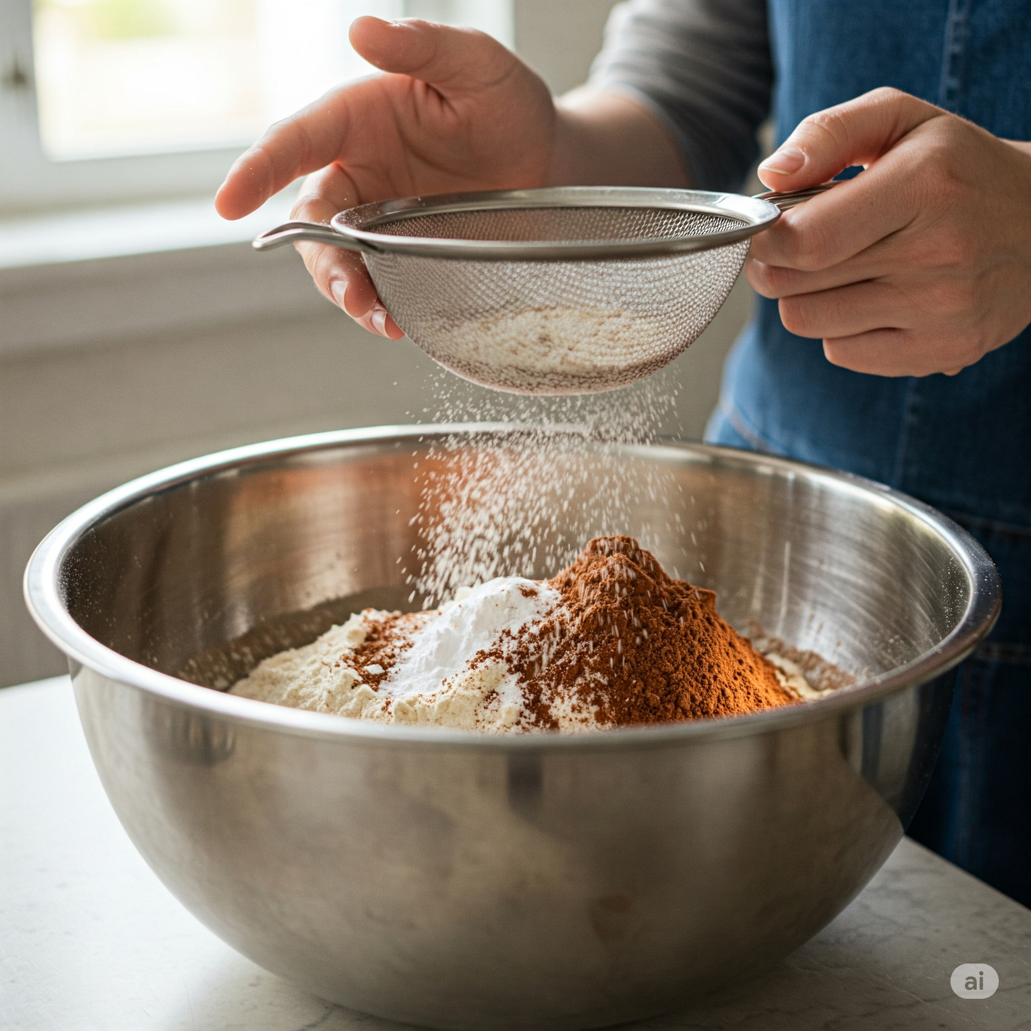 In a separate bowl, sift together the flour, cocoa powder, baking powder, and salt. This ensures no lumps in your batter.