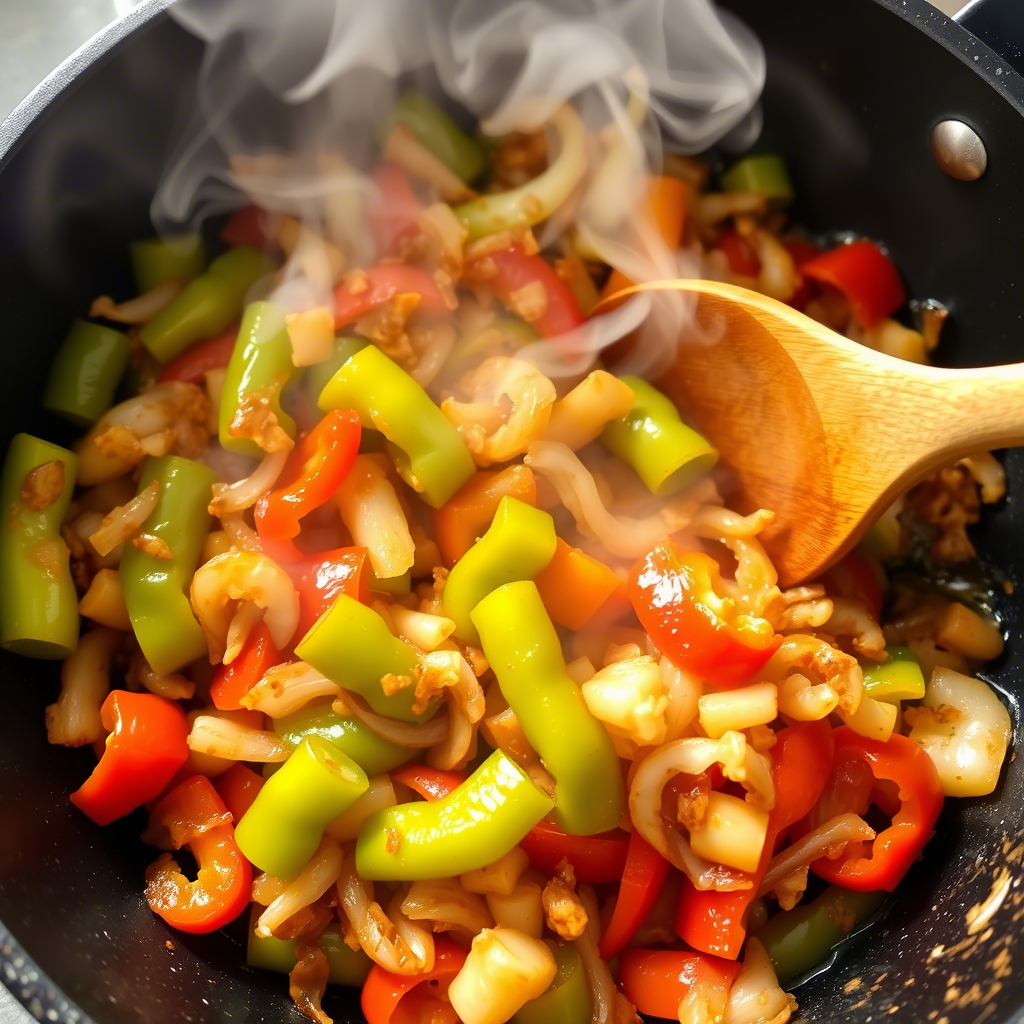 Add the sliced bell peppers and onions to the skillet. Season lightly with salt and pepper. Sauté for 5-7 minutes, stirring occasionally, until the vegetables are softened and slightly charred. Remove from the skillet and set aside.