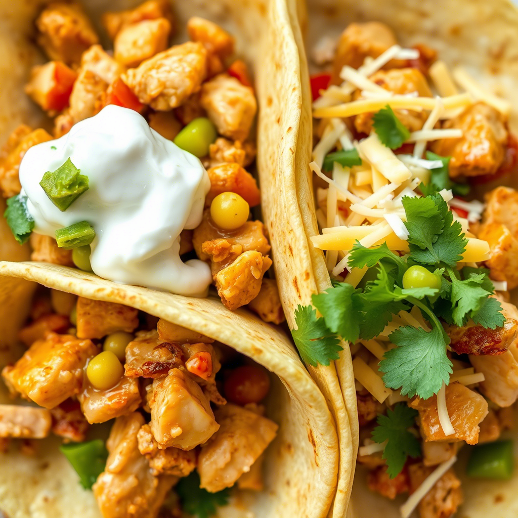 Spoon the chicken and vegetable mixture onto the warm tortillas. Top with your favorite toppings like sour cream, guacamole, shredded cheese, and fresh cilantro.